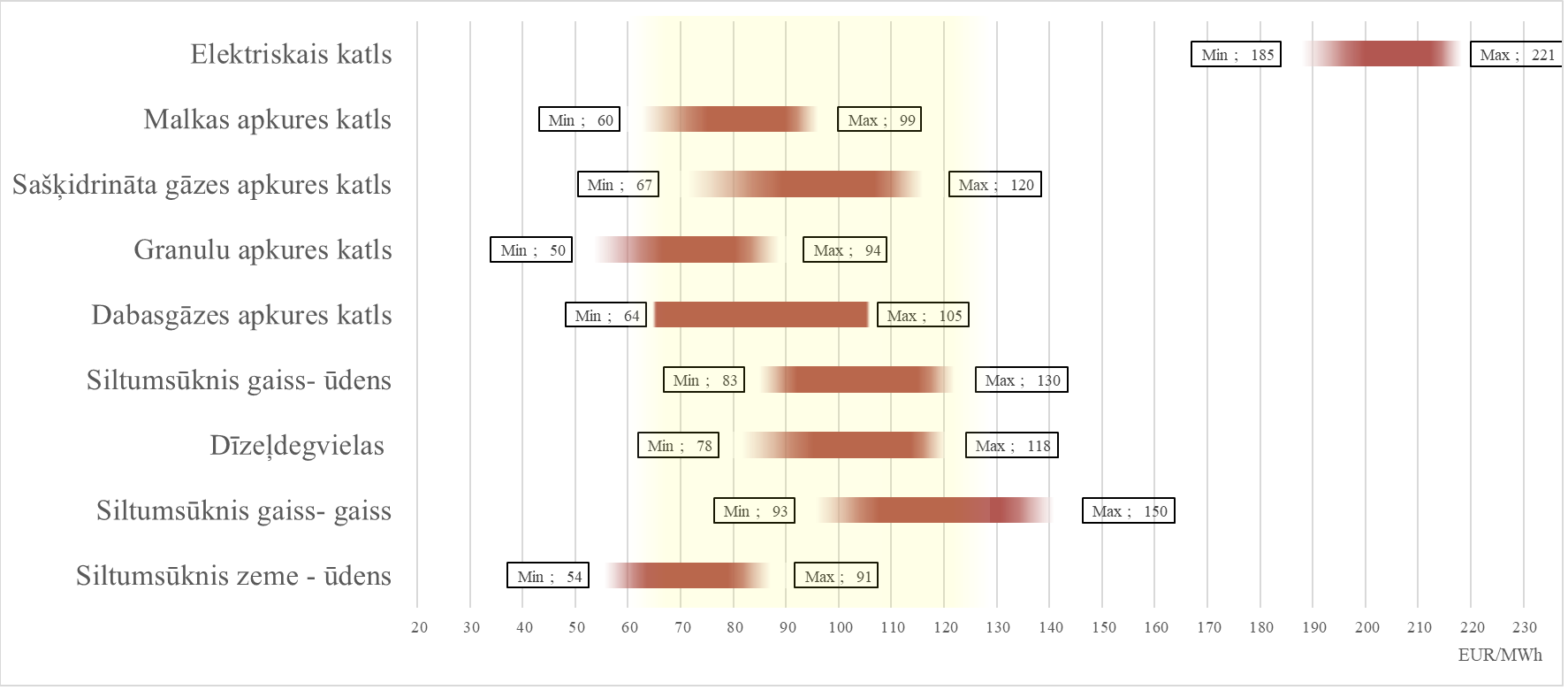 Vērtējot no investīciju prizmas, vislielākie ieguldījumi nepieciešami siltumsūkņu apkures sistēmām un granulu apkures sistēmām. Pārējām apkures sistēmām investīciju apmērs ir līdzvērtīgs. Ekspluatācijas izdevumi visām siltumapgādes sistēmām ir līdzvērtīgi, izņemot sašķidrinātās gāzes apkures sistēmai, kam ekspluatācijas izmaksas pārsniedz 6 reizes pārējo apkures sistēmu izdevumus. Izvēloties risinājumu, būtu jānovērtē arī cilvēkresursu nepieciešamība, ko katra no šīm sistēmām prasa. Dažas sistēmas var būt lētas iegādē, bet ļoti dārgas no kurināmā, tehnoloģiskā vai apkopes viedokļa. Centralizētās siltumapgādes izmaksu salīdzinājumu ar decentralizētu apkures risinājumu izmaksām var redzēt attēlā. Katram no apkures risinājumiem vērtēts, cik identiskos apstākļos varētu izmaksāt viena megavatstunda (MWh) siltumenerģijas. Izmaksu izkliedi rada dažādie tirgus un individuālie tehnoloģiskie apstākļi. Minimālo un maksimālo robežu noteikšanai apskatītas 2024. gada janvārī aktuālākās apkures iekārtu un atbilstošā kurināmā resursu cenas Latvijā. Izmaksu aprēķinā netiek iekļautas pieslēguma un uzstādīšanas izmaksas, kas specifiskos gadījumos var būtiski atšķirties, līdz ar to būtiski ietekmēt arī faktiskās siltumenerģijas ģenerācijas izmaksas. Visām no tehnoloģijām mainīgā izmaksu daļa (kurināmais) sastāda vairāk nekā 60 % no gala cenas. Aprēķinā nav iekļauta arī kurināmā piegādē un tā sagatavošanā patērētais laiks (tai skaitā malkas krāmēšana, brikešu pārnēsāšana, granulu maisu pārkraušana un tā visa glabāšana).